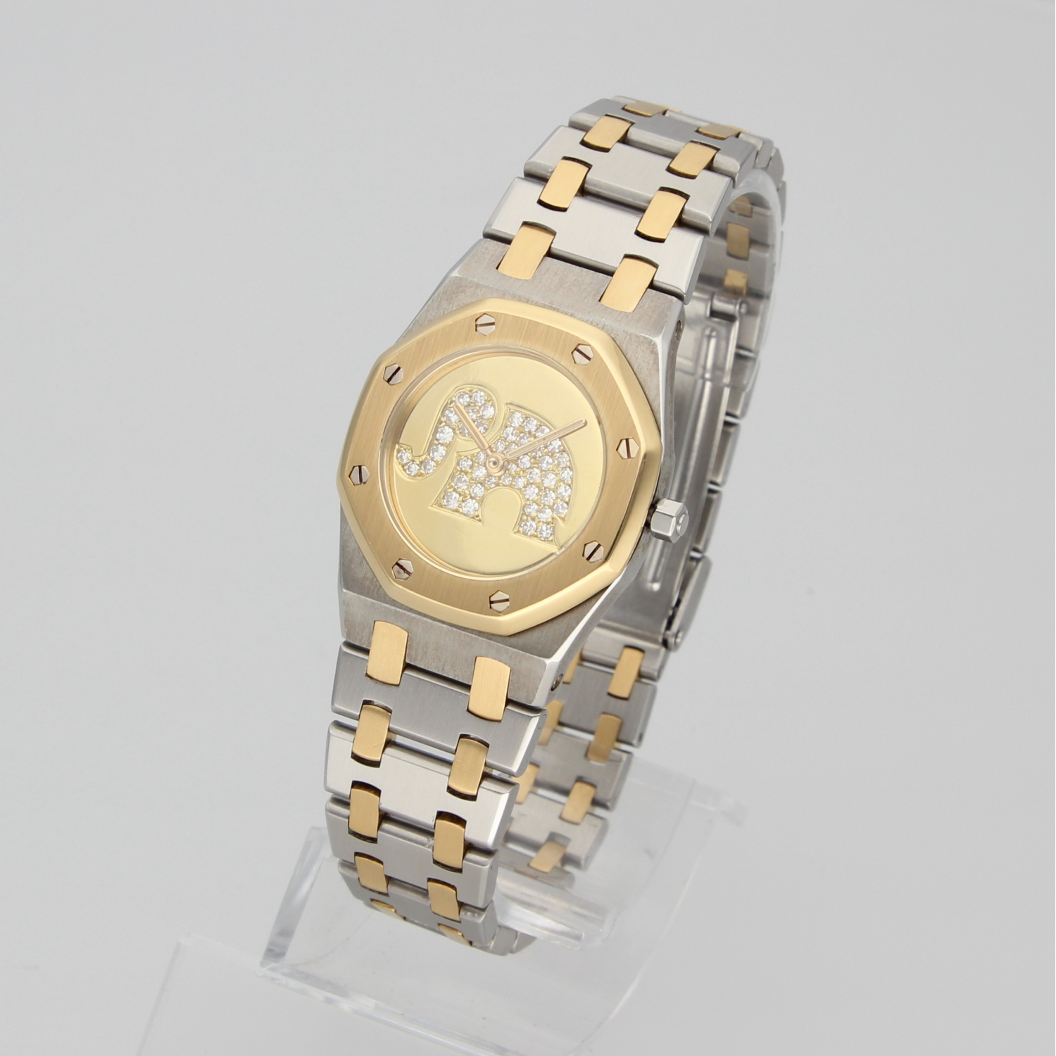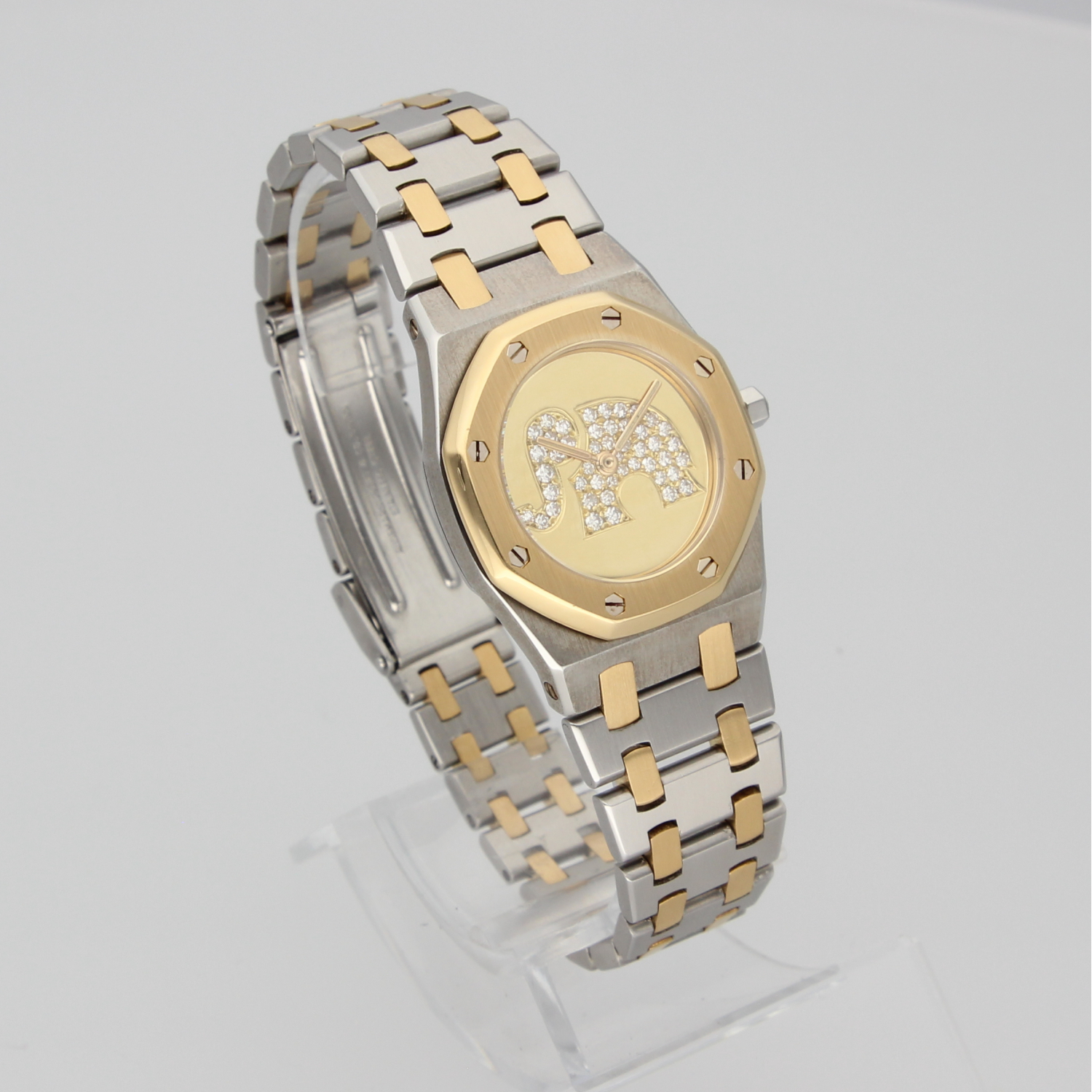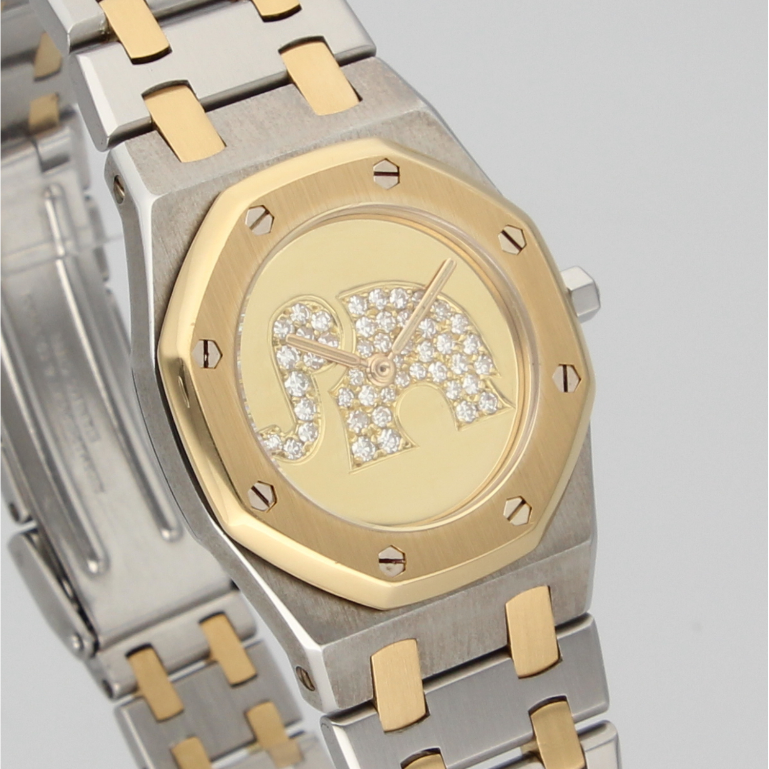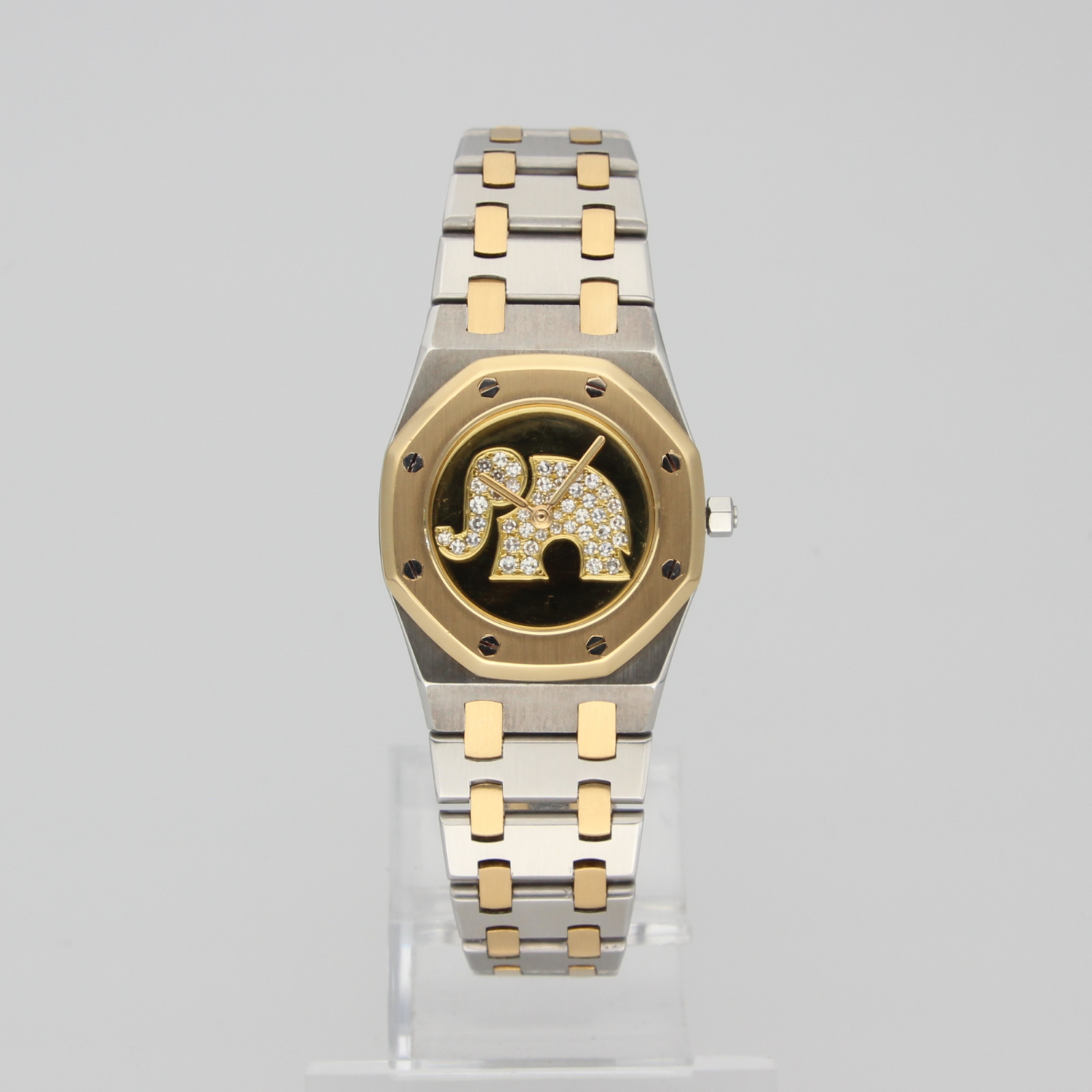 This exceptional Royal Oak Lady features a custom-made 18k gold dial, set with diamonds and artistically shaped into the form of an elephant. Beautifully and professionally executed, the dial is a true work of art within an already iconic watch.
