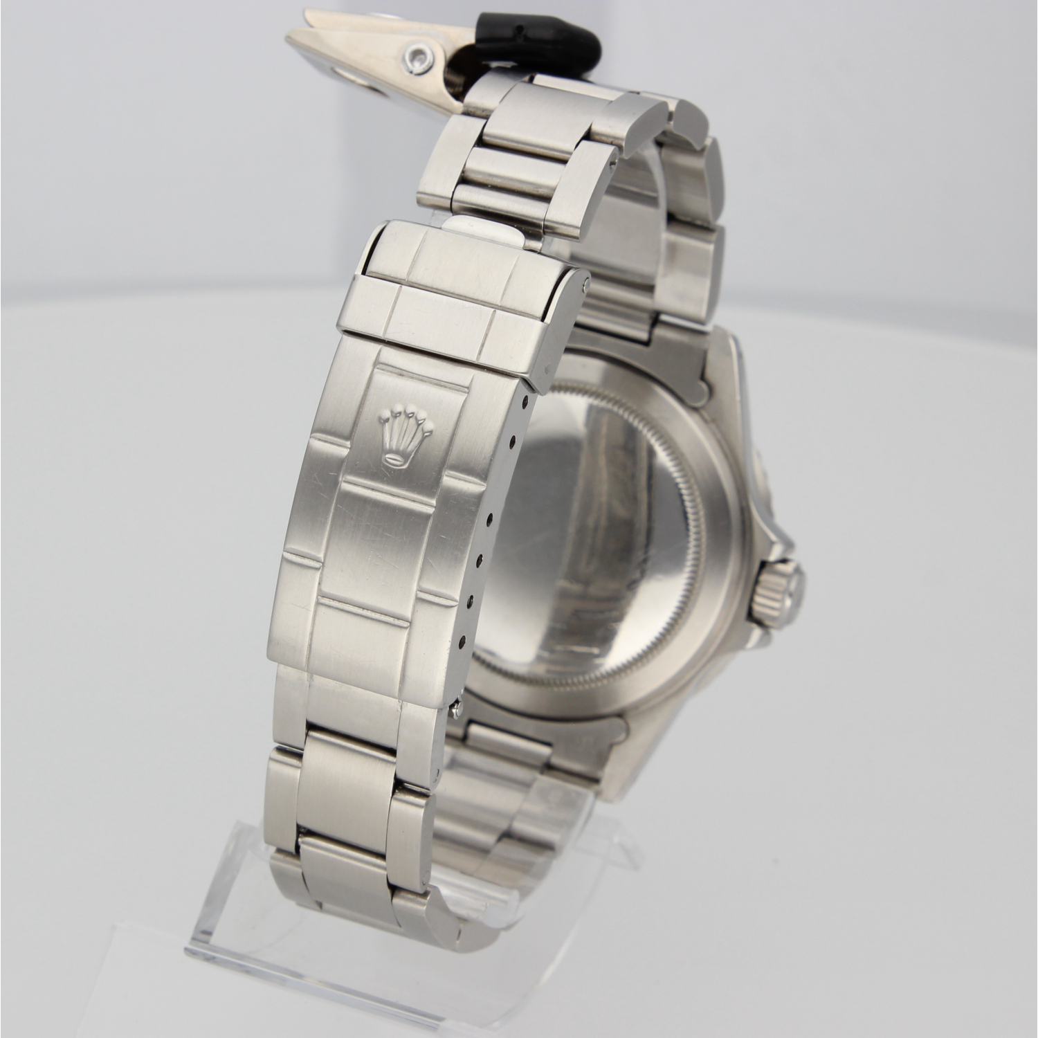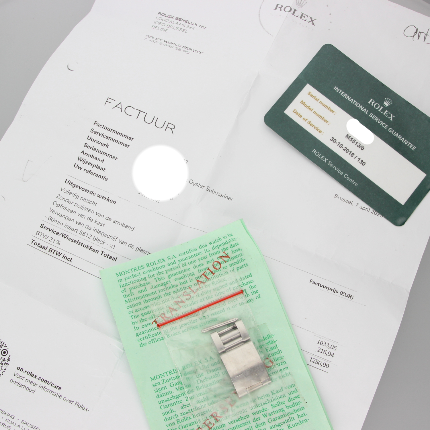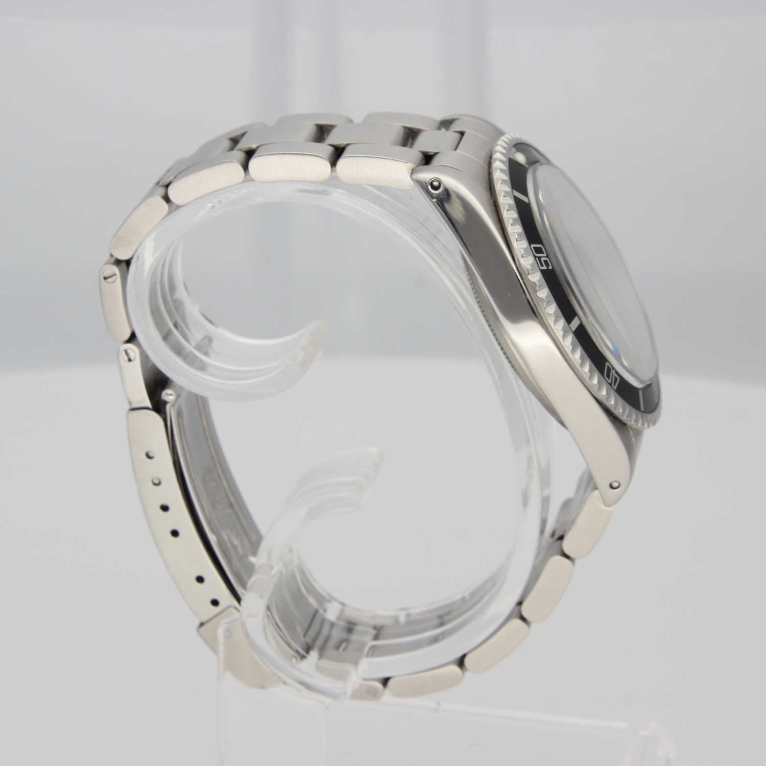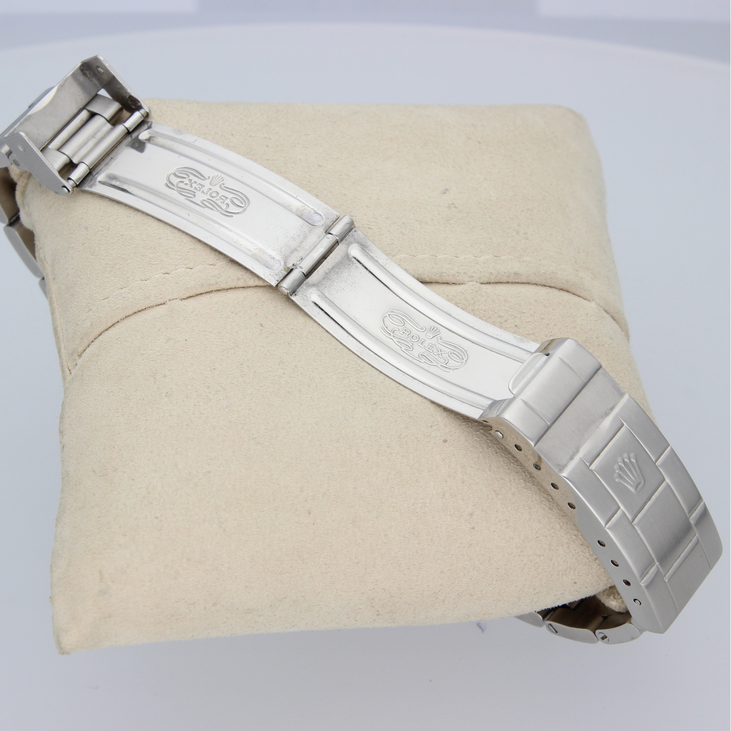This particular Submariner dates from 1989, making it one of the last series produced in the 5513 line. The Oyster bracelet (93150, with matching clasp and 580 end links) shows minimal stretch for its age (fits wrists up to 20cm), and the case is in very good condition. The watch was serviced by Rolex in 2018 and again in 2023. It comes with the original box and an extra deployant clasp, as shown in the photos.